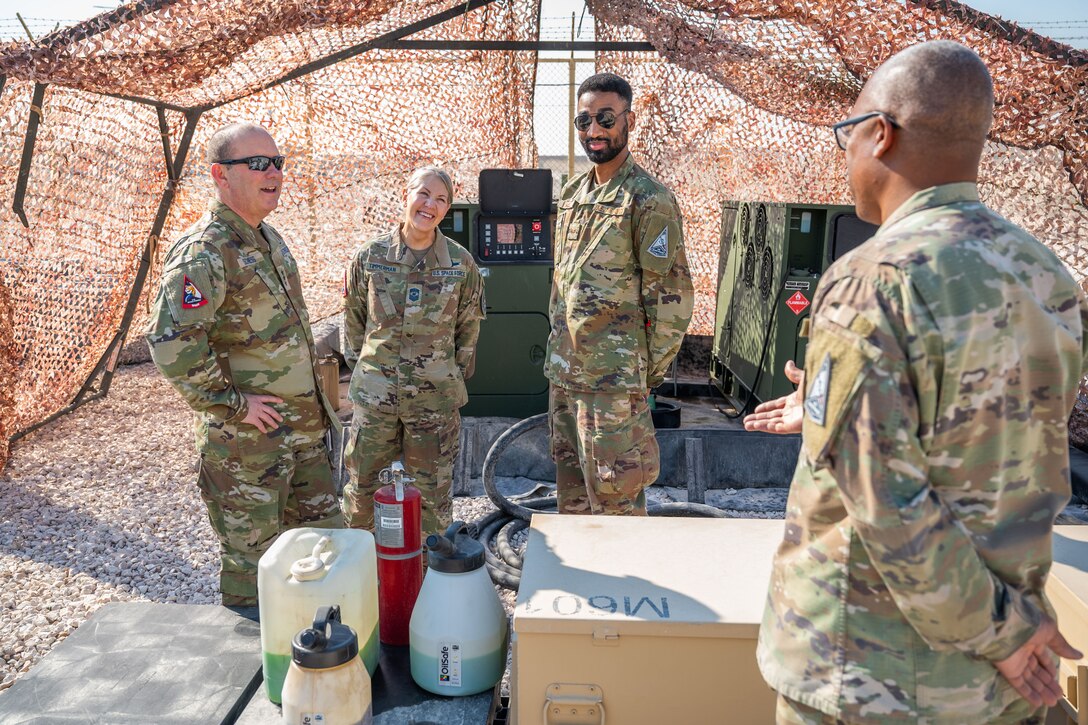 U.S. Space Force Lt. Gen. Douglas A. Schiess, U.S. Space Forces - Space commander and Combined Joint Force Space Component Commander, left, and Chief Master Sgt. Tina R. Timmerman, S4S Command Senior Enlisted Leader, middle-left, speak with deployed members of the 42nd Electronic Warfare Combat Detachment within the U.S. Central Command area of responsibility, Feb. 2, 2025. The 42 EWCD deter threats to space assets by way of defensive cyber operations within the U.S. Central Command area of responsibility. (U.S. Space Force photo by Tech. Sgt. Luke Kitterman)