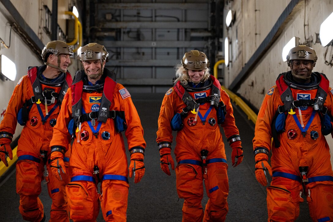 NASA and European Space Agency Astronauts transit down a ramp in the upper vehicle stowage area of amphibious transport dock USS Somerset (LPD 25) during NASA Underway Recovery Test 12 in the Pacific Ocean, March 28, 2025. In preparation for NASA's Artemis II crewed mission, which will send four astronauts around the moon and beyond in the Orion spacecraft, NASA and the Department of Defense will conduct a series of tests to demonstrate and evaluate the processes, procedures, and hardware used in recovery operations for crewed lunar missions. The Department of Defense has many unique capabilities that make it an ideal partner to support NASA, including its amphibious ships with the ability to embark helicopters, launch and recover small boats and provide medical care at advanced onboard facilities. (U.S. Navy photo by Mass Communication Specialist 2nd Class Evan Diaz)
