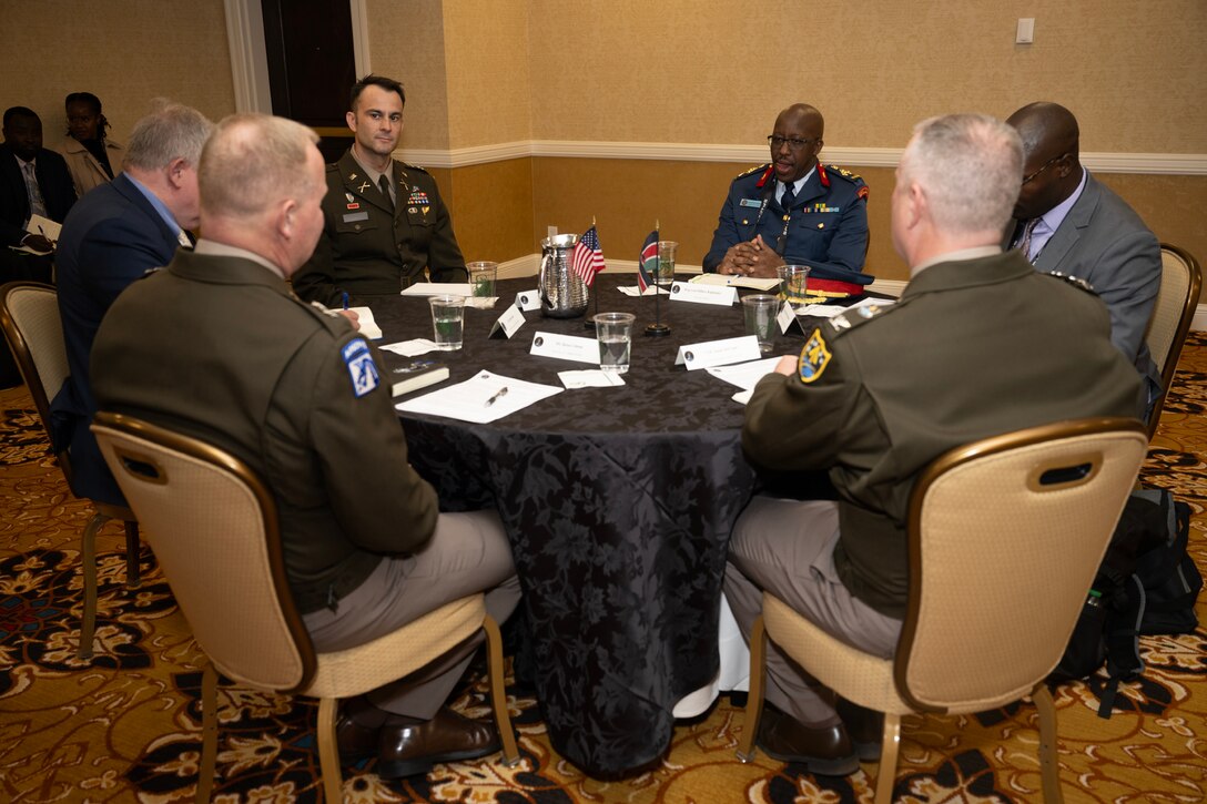 Maj. Gen. Brian Gibson, U.S. Space Command director plans, strategy, and policy, speaks with Brig. Gen. Hillary Kipkosgey Biwott, Kenyan Space Agency Director, during the 40th Annual Space Symposium in Colorado Springs, Colorado, April 10, 2025. During their meeting the two leaders discussed future collaboration possibilities in the space domain and increased military space integration in global exercises. USSPACECOM, working with Allies and Partners, plans, executes, and integrates military spacepower into multi-domain global operations in order to deter aggression, defend national interests, and when necessary, defeat threats.